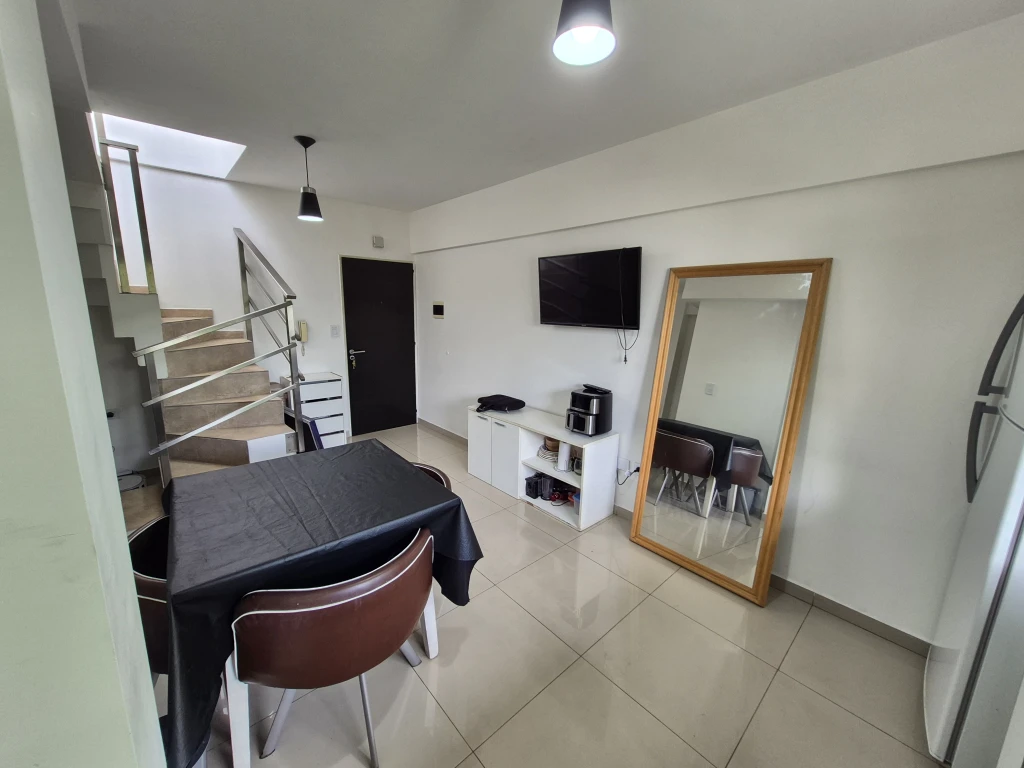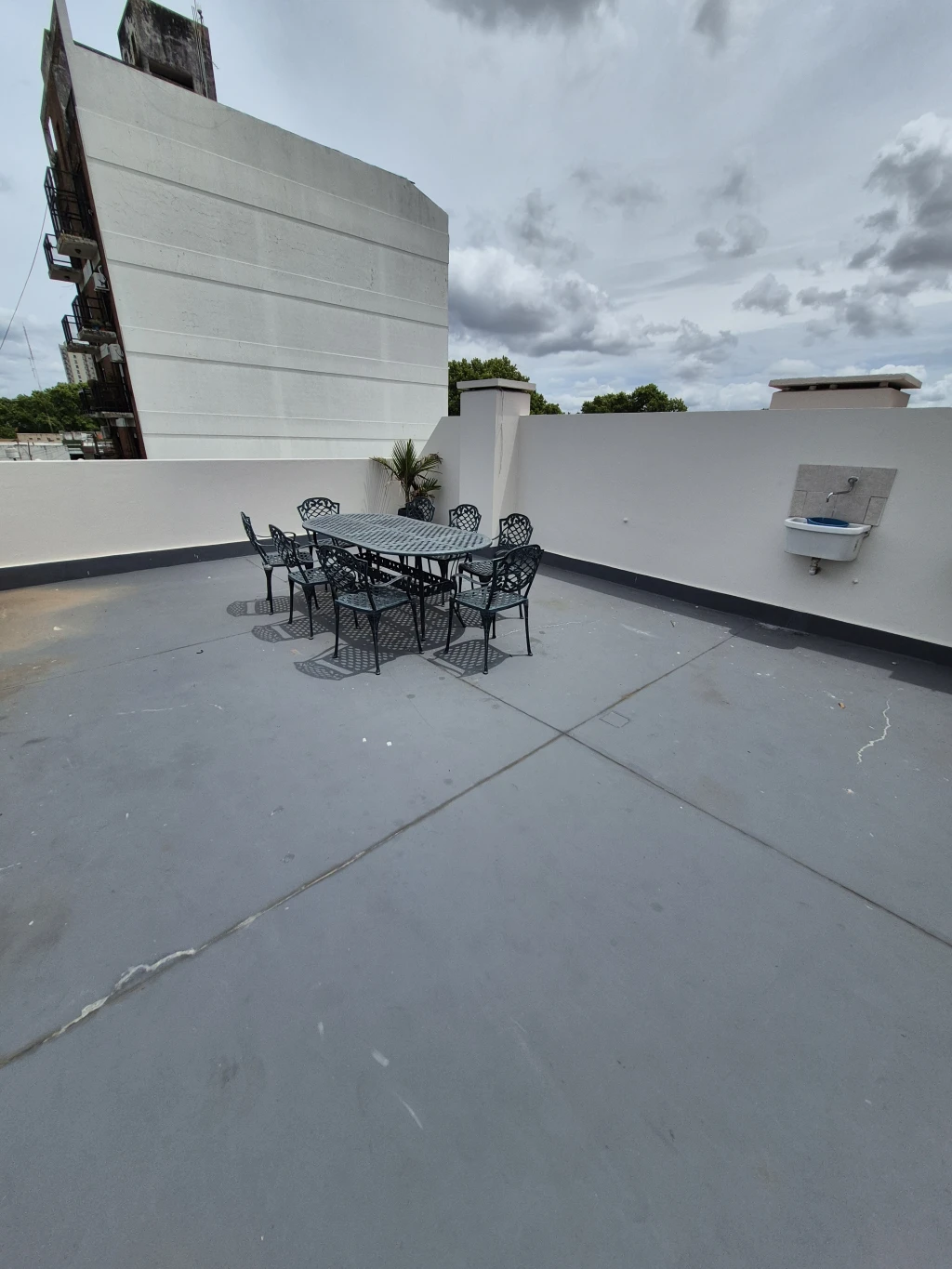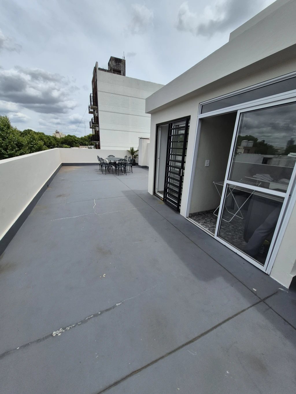 -TERRAZA PROPIA: cuenta con una terraza en planta alta de 60 m2 única en el edifico, lavadero techado con lavarropa y un secarropa, espacio con alero ideal para poner una parrilla, la terraza cuenta con una mesa de fundición de aluminio con 8 sillas, 5 banquetas de plástico y un escritorio.